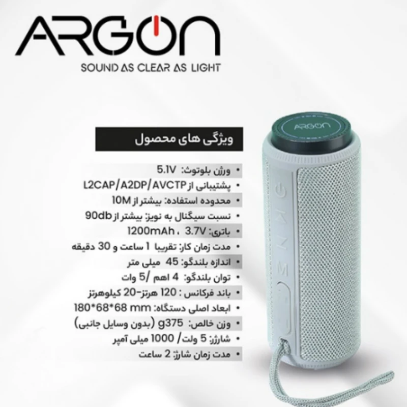 اسپیکر بلوتوثی آرگون مدل AR-B0101یکی از بروزترین سیستم های صوتی موجود در بازار است.این دستگاه میتواند از طریق بلوتوث به گوشی های هوشمندوTVمتصل شود.طراحی این اسپیکر قابل حملARGONاستوانه ای شکل است وظاهری ساده و جمع وجوری دارد ودر ابعاد 68*68*180میلیمتر و وزن خالص 375 گرم عرضه میگردد.این اسپیکر با توان خروجی 4اهم/5وات گزینه ی بسیار مناسبی برای خرید است.از جمله قابلیت های اسن اسپیکر میتوان به قابلیت پشتیبانی از پورت های A2DP،L2CAPوAVCTPاز طریق بلوتوث اشاره کرد.ورژن بلوتوث 5.1V بوده وتا متر مسافت را پشتیبانی میکند.نسبت سیگنال به نویز بیش از 90DB و دارای باتری 3.7 ولت و1200 میلی آمپر ساعت میباشد.با 2 ساعت زمان شارژ میشود و به میزان 1ساعت و نیم قابل استفاده است.اندازه ی بلند گو در این اسپیکر 45 میلیمتر است.فرکانس 120 هرتز-20 کیلوهرتز دارد.دارای پورتUSB و ورودی کارت حافظه وAUXمیباشد.این اسپیکر جذاب در رنگ های قرمز،مشکی،خاکستری وسبز تیره موجود میباشد.